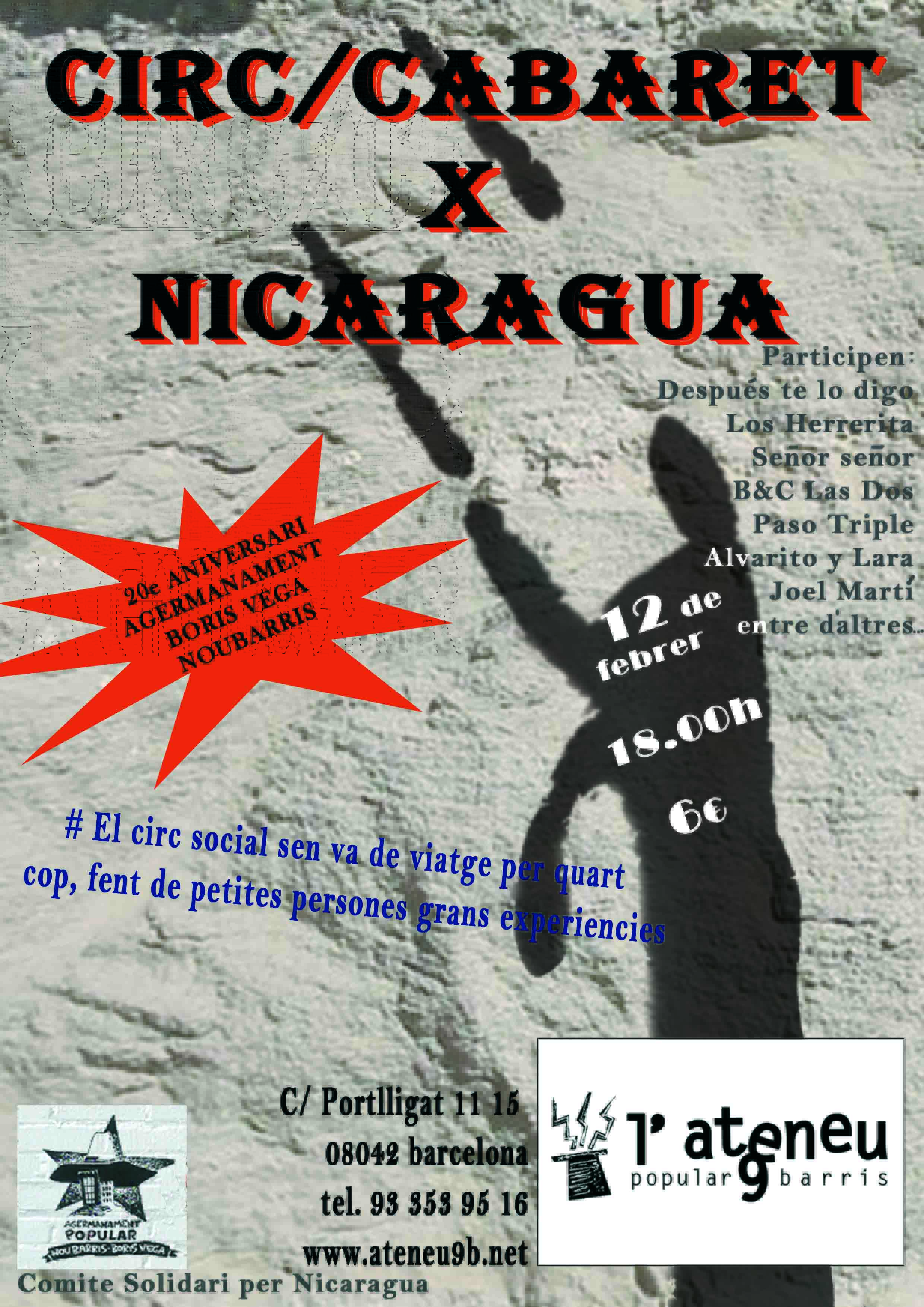 Si voleu conèixer aquest projecte de primera mà i donar suport heu de venir al Circ Cabaret Solidari per Nicaragua. L’esdeveniment tindrà lloc el dia 12 de febrer a les 18:00 al teatre de l’Ateneu Popular de Nou Barris.