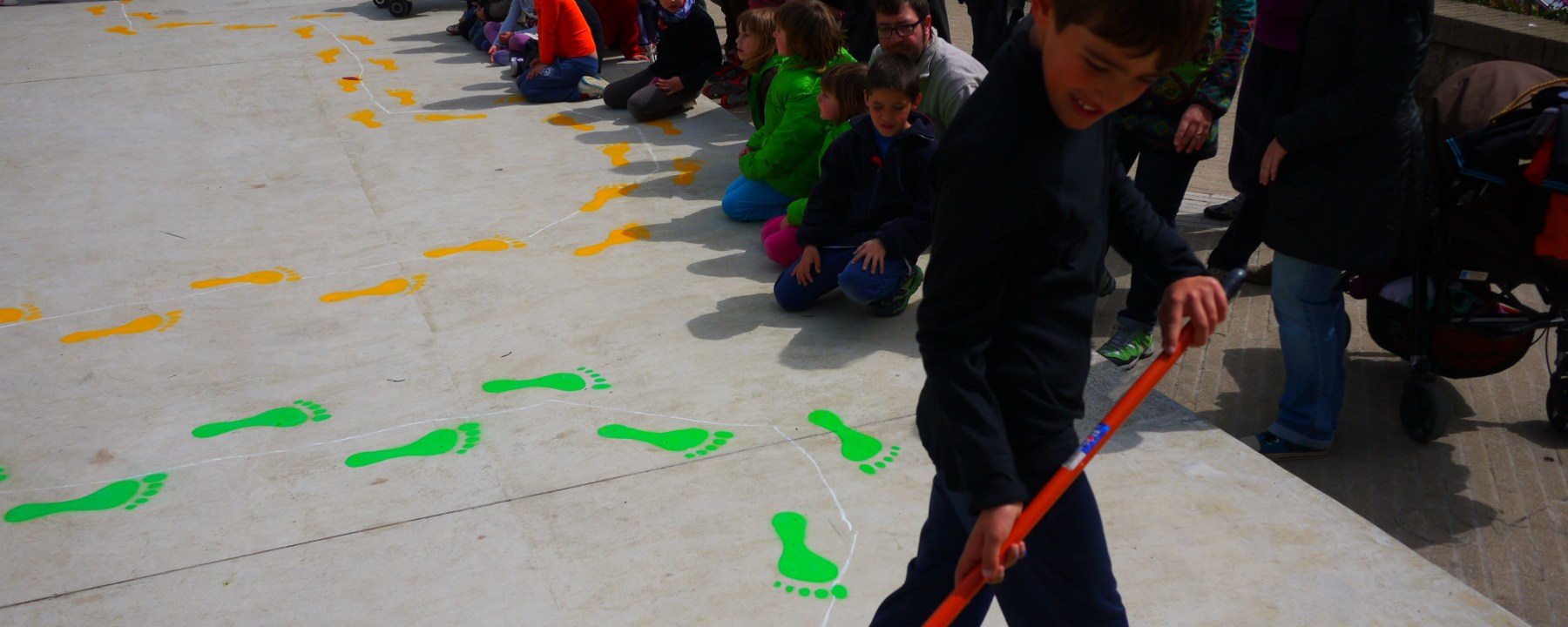 El dissabte 29 de març desenes de veïns de totes les edats van pintar amb esprais petjades al terra d’una plaça del barri de Roquetes del districte barceloní de Nou Barris. A través de la xarxa veïnal s’han organitzat per deixar constància del bon ús que podria haver tingut l’espai. I ho ha fet a través d’una intervenció artística coordinada per Conny Memm, mare de l’AMPA de l’escola Antaviana i arquitecte, i l’artista i també arquitecte Leix.