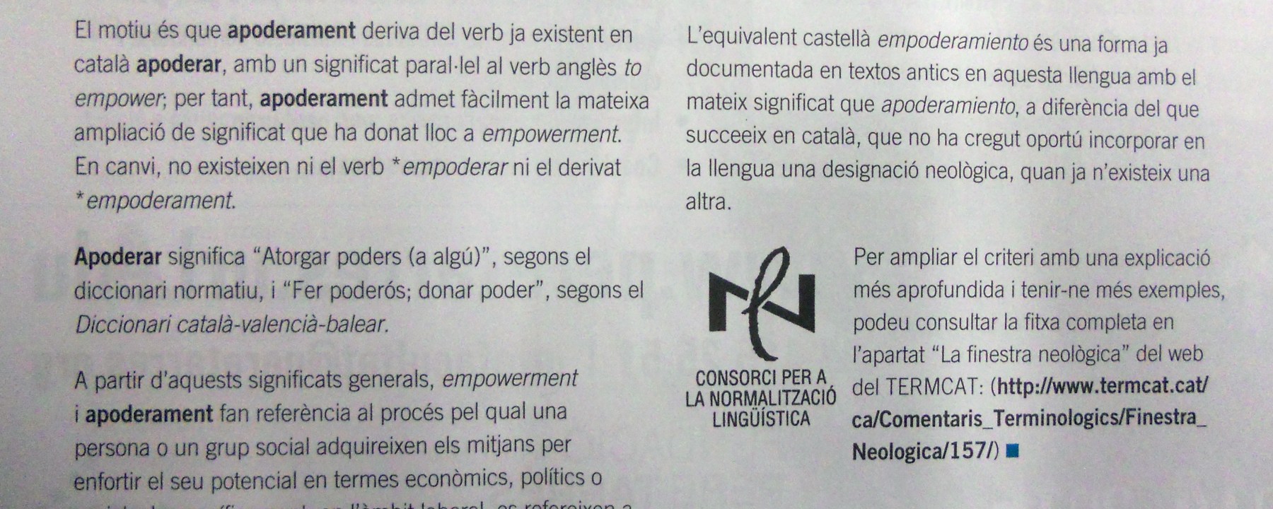 Afegiria, per liar més la troca, que, al menys en castellà, les connotacions del terme “apoderamiento” són molt diferents. En una altra nota al peu, en aquest cas en un capitol de llibre que vaig publicar al 2009, vaig escriure això: