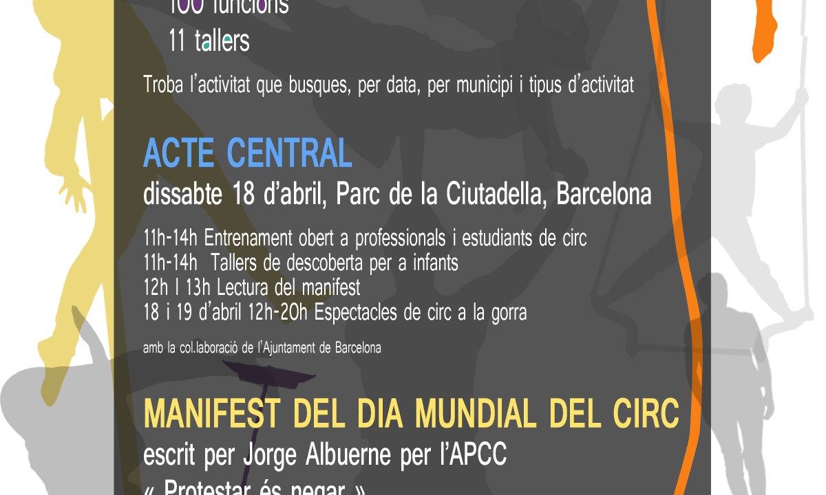 A part d’un manifest contundent, el Dia Mundial del Circ a Catalunya tindrà dues setmanes d’activitats per posar el circ al capdavant de l’activitat cultural, en una commemoració, d’abast internacional, amb més de 60 activitats (espectacles, tallers, exposicions) en 21 municipis, gairebé 100 funcions i 100 companyies de circ seran els protagonistes de la celebració a Catalunya del Dia Mundial del Circ, que aquest any se celebra entre el 10 i el 19 d’abril.