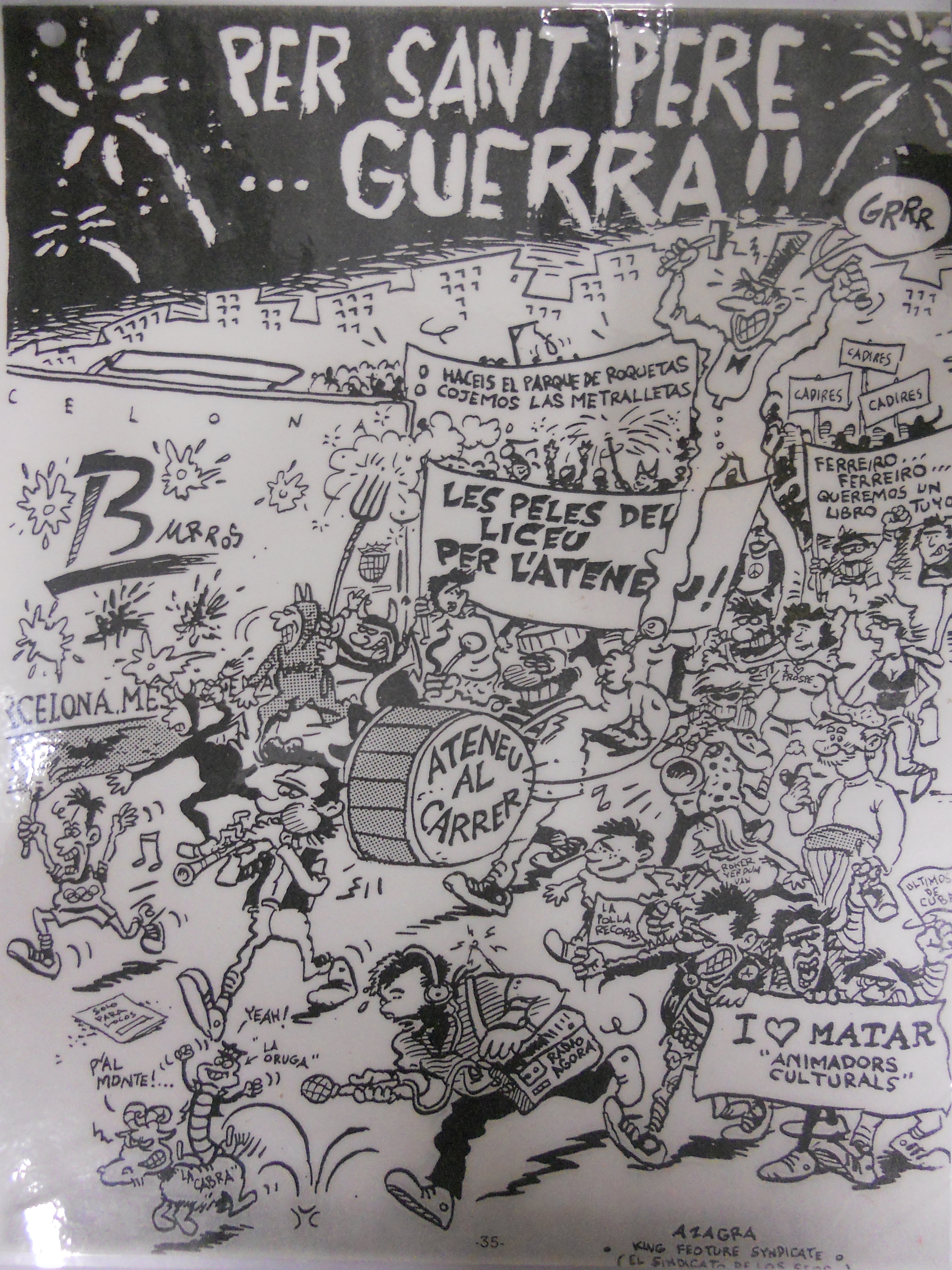 A la part de sota a la dreta del cartell apareix una pancarta que diu “I love matar Animadors Culturals”. És una provocadora frase per explicar un moment històric a Barcelona i alhora permet parlar sobre la posició ideològica de la figura de l’Animador Sociocultural.