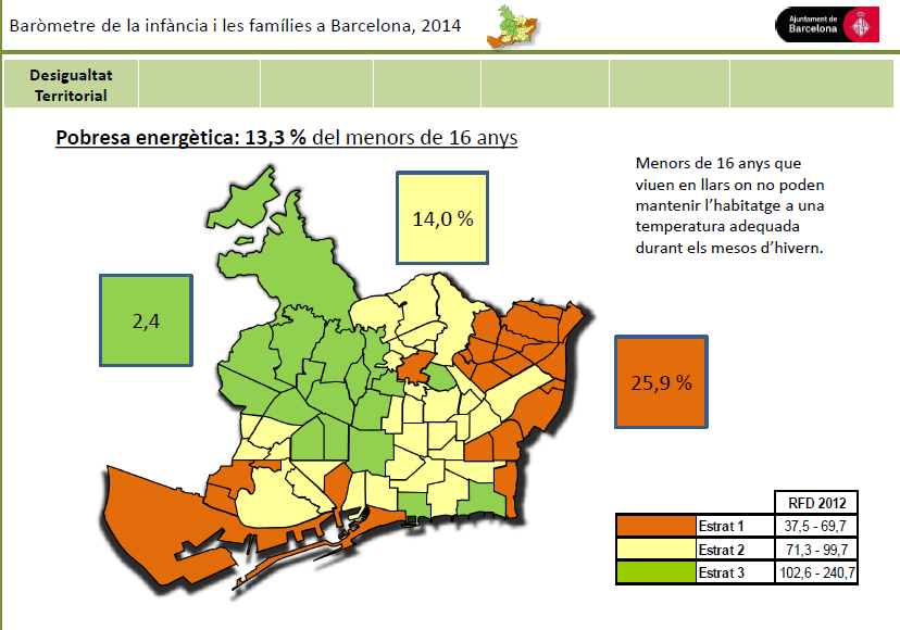 El Baròmetre de la infància i les famílies a Barcelona (2014) -la primera radiografia completa de la situació de les llars amb nens- mostra que les desigualtats econòmiques entre els barris s’han agreujat i que els nens de famílies amb rendes més baixes tenen més carències alimentàries i materials, i pitjors resultats acadèmics.