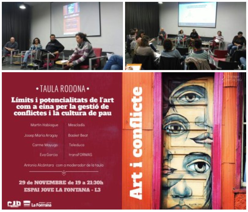 Al passat dimarts 29 de novembre vam fer una taula rodona de 2,5h en la que vam poder parlar sobre l’Art com eina educativa, de mediació de conflictes i de transformació social. La vam fer a l’Espai Jove la Fontana en el marc d’un curs més ampli encarregat pel Consell de la Joventut de Barcelona. A la taula van participar Carmen Mayugo de Teleduca, Martin Habiague de Mescladís, Josep Maria Aragay de Basket Beat, Eva Garcia de transFORMAS i jo, l’Antonio Alcántara, vaig tenir el luxe de dinamitzar-la.