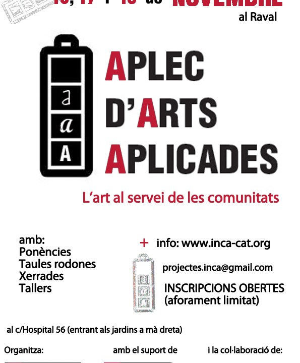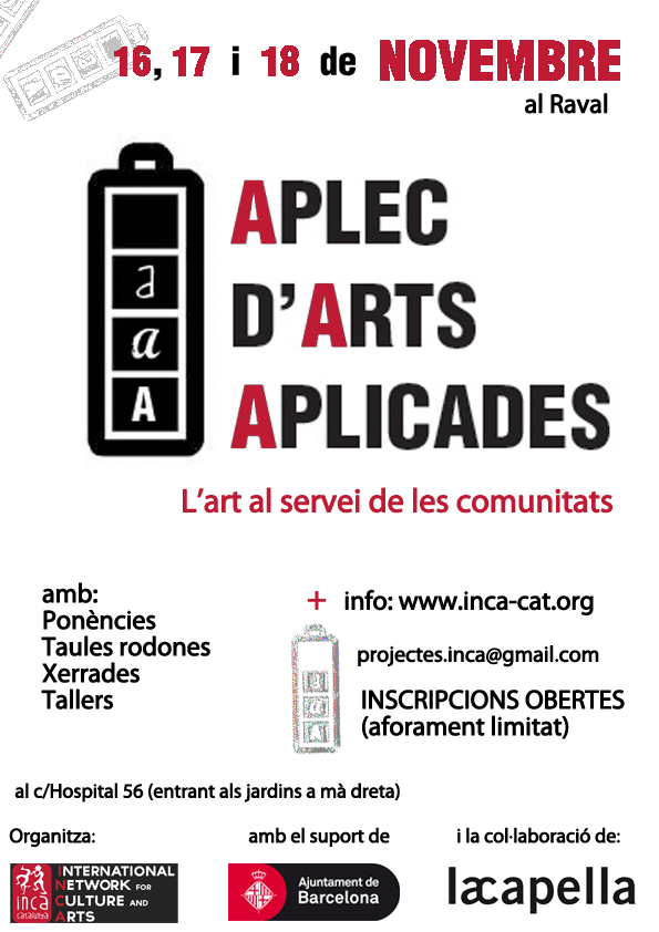 Els propers 16, 17 i 18 de novembre tindrà lloc l’Aplec d’Arts Aplicades a Barcelona al barri del Raval concretament al carrer Hospital num. 56 (als Jardins de Rubió i Lluch, entrant a mà dreta) amb un programa que inclou taules rodones, ponències, i xerrades realitzades per més de 20 professionals, entitats i col·lectius artístics i d’acció comunitària. A més de cinc tallers experiencials amb diferents professionals de les arts i la creació comunitària.