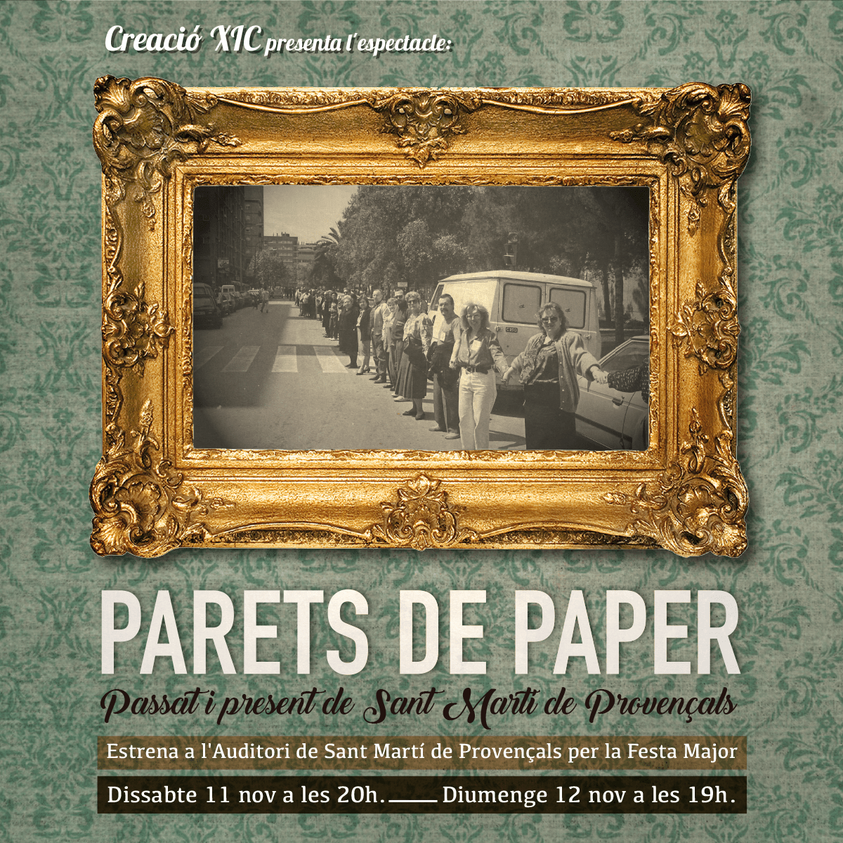Parets de paper és una producció de teatre comunitari creada i interpretada per una trentena de veïns i veïnes d’una gran diversitat, amb la col·laboració d’entitats i equipaments culturals. Aquest espectacle és el resultat de la primera edició de Creació XIC al districte de Sant Martí, un projecte comunitari d’arts escèniques que promou la convivència en la diversitat als barris de Barcelona des del 2011.
