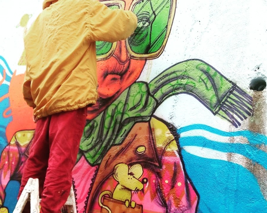 La companya i professora Empar Navarro avisava d’un projecte amb Grafitti que han fet més de trenta alumnes de l’Institut La Pineda del barri de Sant Crist de Badalona. En ell ha participat la seva amiga Noemí Quiros, que és la integradora social de l’institut. Noemí ens ha explicat que les idees plasmades van sorgir d’un taller que van fer amb cinc nois grafiters Rughi, Node, Brk, Marti, Lesk i una dona graffitera amb el nom de Sam.