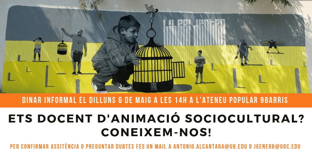 Hem quedat el dilluns 6 de maig a les 14h per fer un dinar informal a l’Ateneu Popular 9Barris. Per confirmar o preguntar dubtes escriu a a antonio.alcantara@ub.edu o jgenerb@uoc.edu