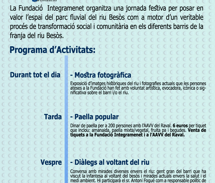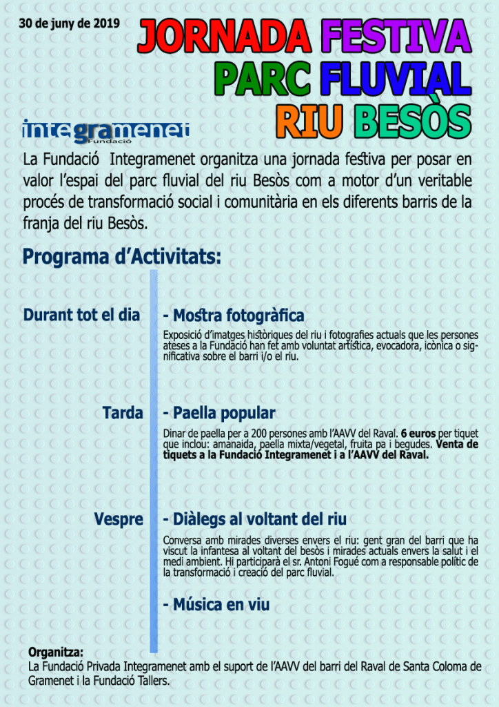 El proper 30 de juny, en el marc de la Festa Major del barri del Raval de Santa Coloma, la Fundació Integramenet ha organitzat una jornada festiva i cultural amb l’objectiu de posar en valor l’espai del parc fluvial del Besòs com a motor d’un veritable procés de transformació social i comunitària en els diferents barris de la franja del riu.