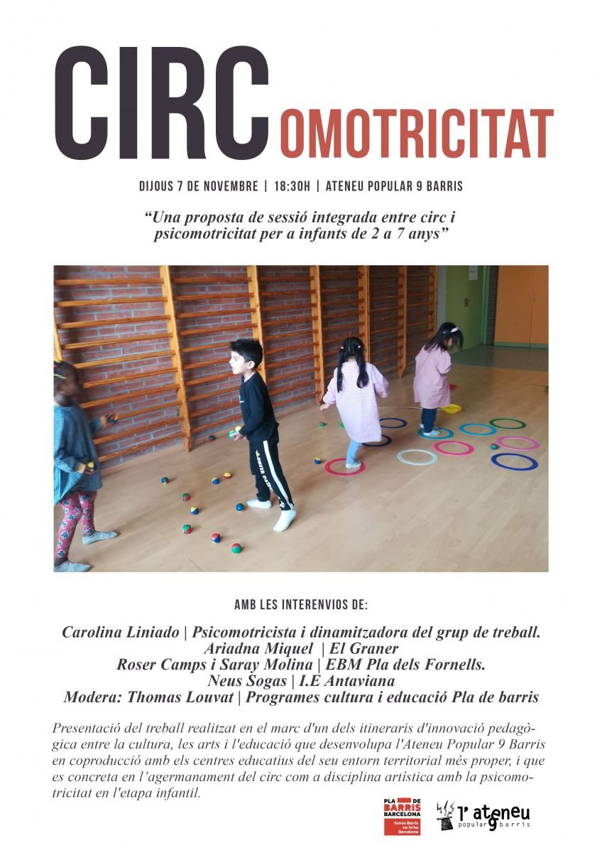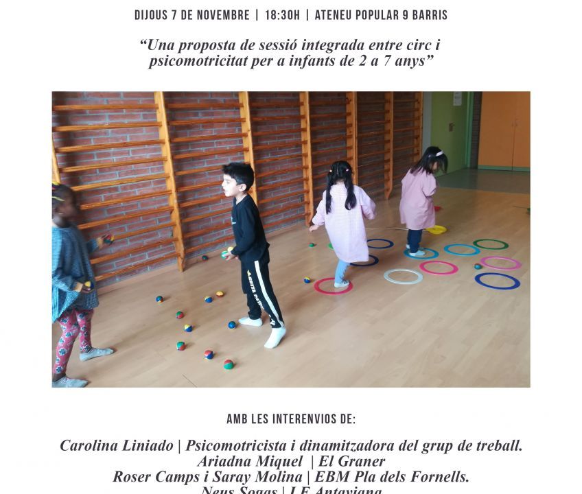 El proper 7 de novembre a les 18.30h realitzem una sessió de presentació del procés de treball que hem fet al voltant del Circ i la psicomotricitat amb infants de 2 a 7 anys, en el marc d’un dels itineraris d’innovació pedagògica entre la cultura, les arts i l’educació que desenvolupa l’Ateneu Popular 9 Barris en coproducció amb els centres educatius del seu entorn territorial més proper, i que es concreta en l’agermanament del circ com a disciplina artística amb la psicomotricitat en l’etapa infantil.