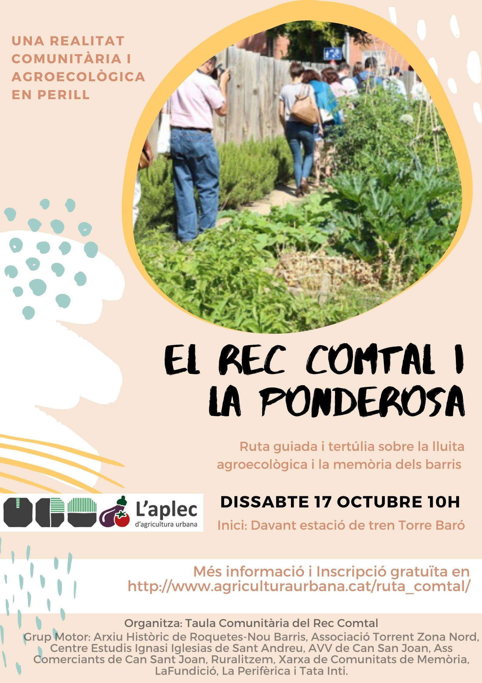 Ruta des de Torre Baró, passant per Vallbona i arribant a Montcada Can Sant Joan. El recorregut és seguint el Rec Comtal i passant davant de l’horta de la Ponderosa. Finalitzarem el recorregut a la Plaça Bosc de Can Sant Joan amb un refrigeri acompanyat d’una tertúlia sobre la lluita agroecològica i la memòria viva dels barris. Ens acompanyaran el Grup de Patrimoni de l’H que reivindiquen el canal de la Infanta, paral·lelisme de l’altre costat de la ciutat amb el Rec Comtal, regava horts des de Molins de Rei fins a Sants. El punt final de la ruta es troba a 5 minuts de l’estació Montcada Bifurcació. Finalitzarem tota l’activitat a les 13.30h