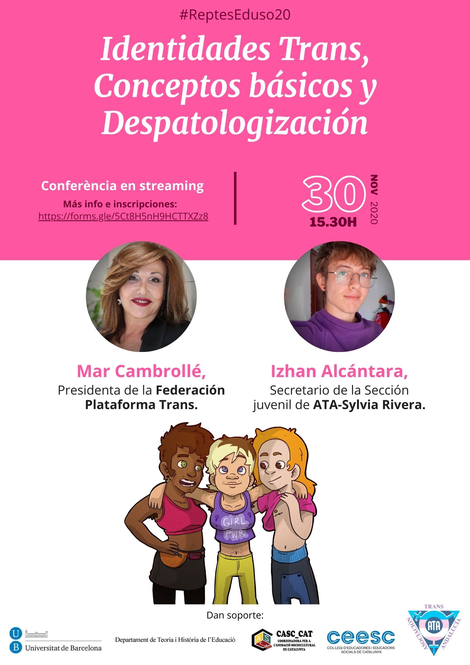 Mar Cambrollé presidenta de la Federación PlataformaTrans e Izhan Alcántara, secretario de la sección juvenil ATA-Sylvia Rivera. Ens aproparan a la lluita per la despatologització i l’autoderminació de les persones trans en un moment on està en discussió la llei trans en el govern espanyol. Es fa en el marc del Cicle de Conferències de l’assignatura d’Interrogants i Reptes de l’Educació Social de la Facultat d’Educació de la Universitat de Barelona.