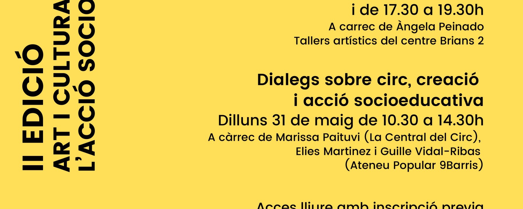 -Dilluns 31 de maig de 10.30 a 14.30h. Diàlegs sobre circ, creació i acció socioeducativa. Amb Marissa Paituví de la Central del Circ i Elies Martínez i Guille Vidal-Ribas de l’Ateneu Popular 9 Barris.