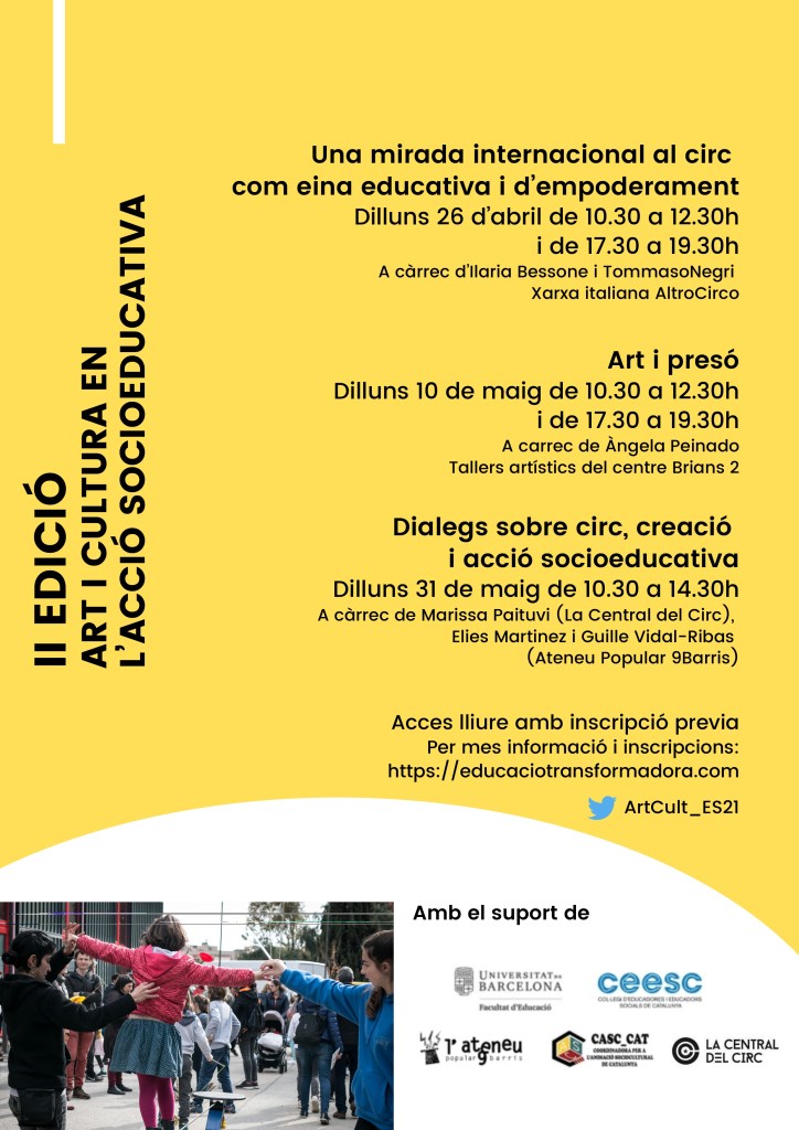 Activitat amb el suport de la Facultat d’Educació de la Universitat de Barcelona, Col·legi d’Educadores i Educadors Socials de Catalunya, Coordinadora per l’Animació Sociocultural de Catalunya, la Central del Circ i l’Ateneu Popular 9 Barris.