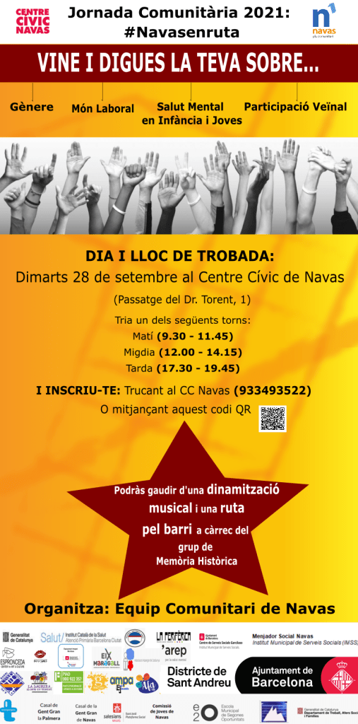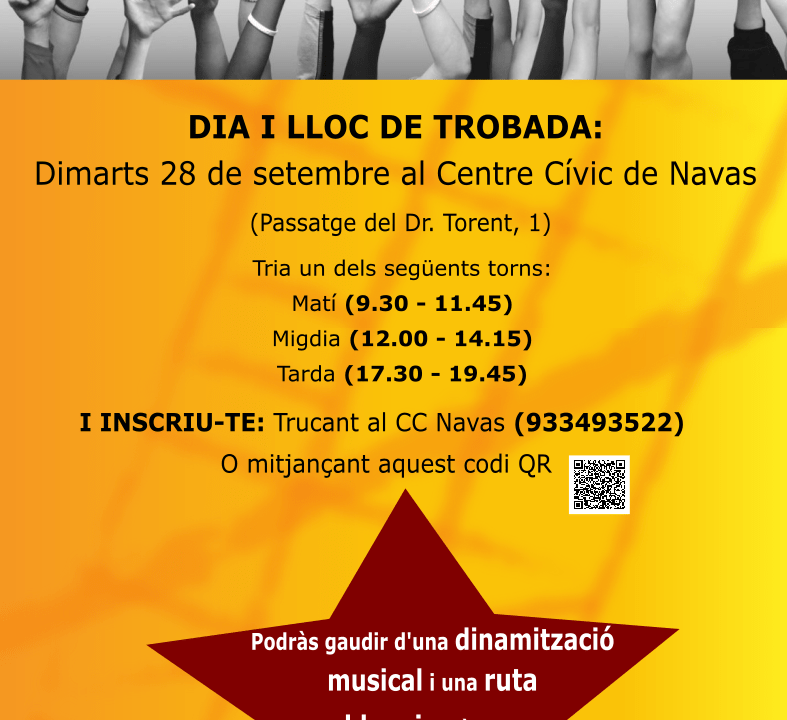 En tots els torns el punt de partida serà el Centre Cívic Navas (Passatge del Dr. Torent, 1), espai on es farà l’obertura de la Jornada mentre gaudim d’una dinamització musical de fons. Tot seguit, es configuraran dos grups i cadascun d’ells tindrà una ruta establerta a Navas amb dues parades. El grup estarà guiat per un membre de l’Equip Comunitari i entre punt i punt coneixerem alguns elements de la història del barri de la mà del grup de Memòria Històrica.