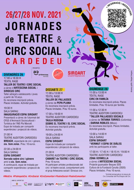Així que reserveu les dates del 26, 27 i 28 novembre!! Organitza Sirocus Circ i Artescena Social ( SIROART) al Teatre Auditori de Cardedeu, tres dies d’espectacles de circ i teatre social, tallers de pallasses i circ en família, taula rodona de reflexió i debat sobre el teatre i el circ en perspectiva de gènere, espai de trobada i experiències.