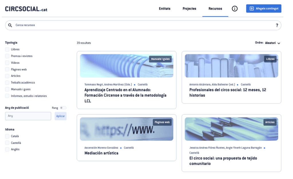 Els fons d’entitats i el de projectes donen accés a fitxes en les quals descobrir detalls sobre organitzacions catalanes o d’altres territoris que duen a terme diversos tipus d’iniciatives amb un mínim denominador comú: el circ com a mitjà per generar impactes en la societat. Accessibles des d’un llistat o des d’un mapamundi, aquestes fitxes inclouen informació sobre els objectius i les característiques de la seva activitat, i poden incloure enllaços i coordenades digitals, dades de contacte o continguts audiovisuals. D’altra banda, el fons de recursos recull enllaços o referències a documents publicats en diversos formats: llibres, revistes, webs, articles acadèmics, vídeos o literatura grisa, entre altres Tots tres fons permeten dur a terme una cerca avançada per mitjà de l’aplicació de filtres segons ubicació, temporalitat o paraules clau, per exemple.