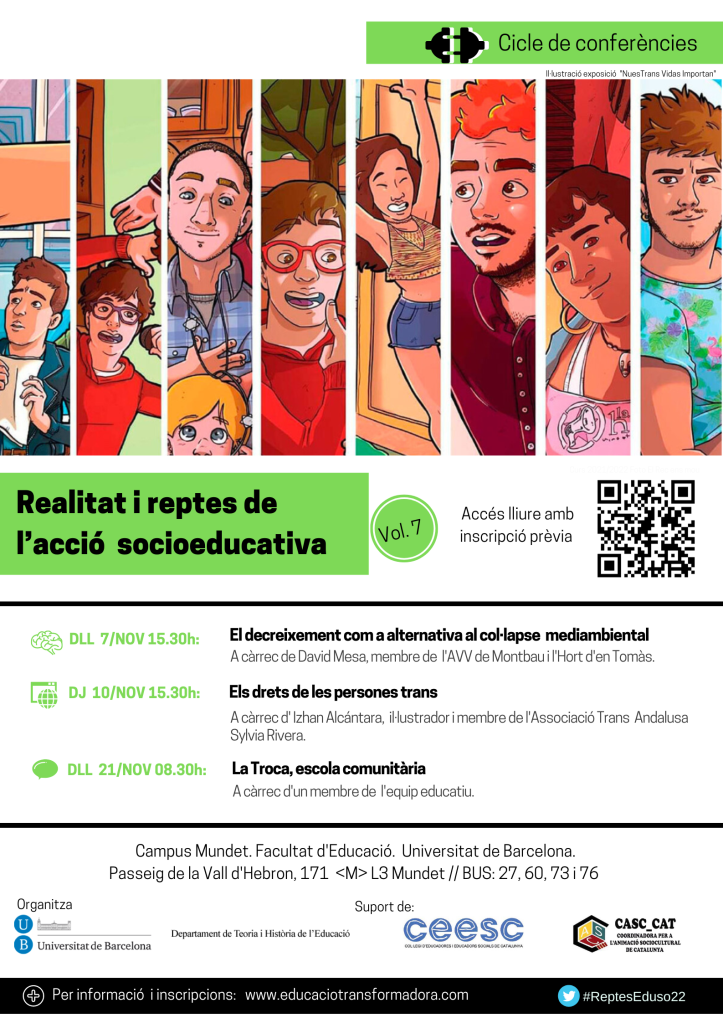 Totes les conferències són en el Campus Mundet de la Facultat d’Educació de la Universitat de Barcelona. I es compta amb el suport del CEESC i de la CASC_CAT (Col·legi d’Educadores Socials de Catalunya i la Coordinadora per l’Animació Sociocultural de Catalunya).