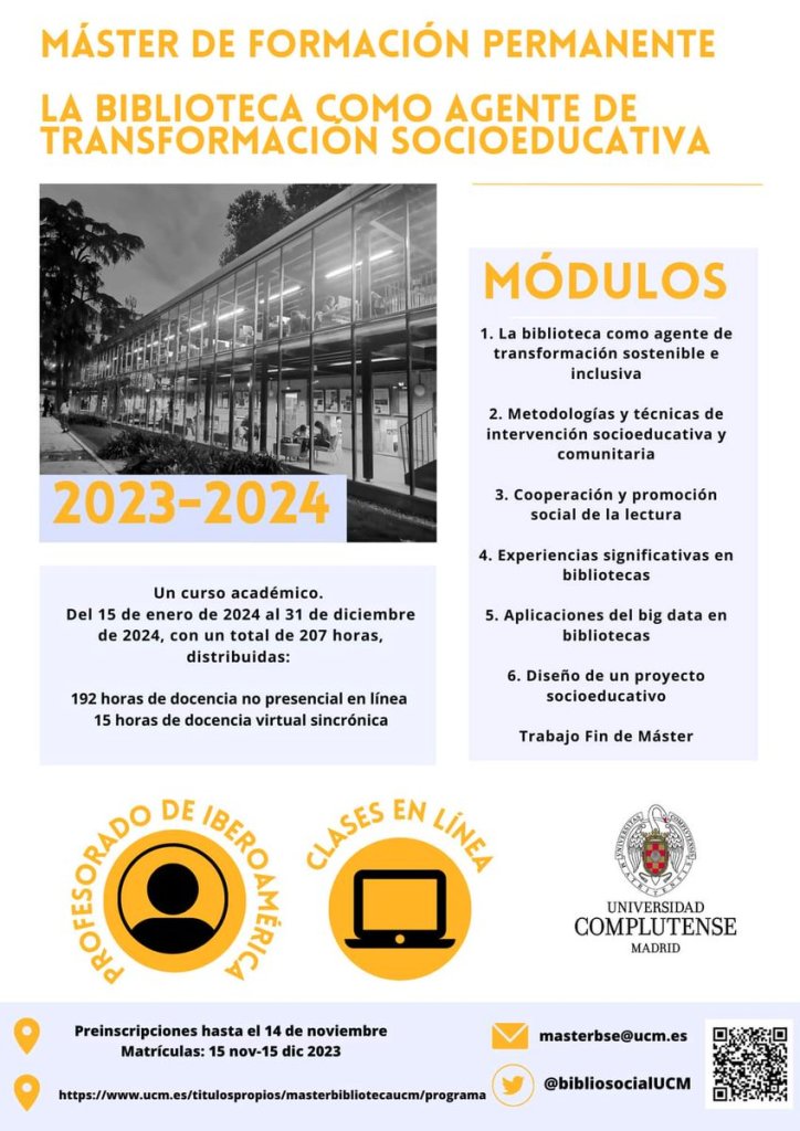 Ahora han abierto el periodo de preinscripción de la II edición del Máster de Formación Permanente La biblioteca como agente de transformación socioeducativa, un título de la Universidad Complutense de Madrid. La preinscripción se podrá efectuar hasta el 14 de noviembre y las matrículas entre el 15 de noviembre y el 15 de diciembre de 2023.