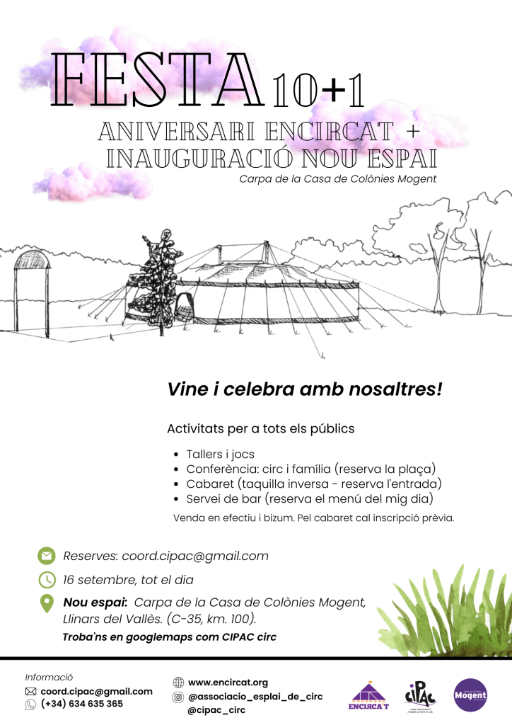 El pròxim 16 de setembre fan la festa d’inauguració a la nova seu. I, aprofitaran també per a celebrar un doble aniversari: els 10 anys d’Encircat i el primer any del CIPAC, 10+1!!! Hi haurà activitats per gaudir en família: tallers durant el dia, jocs i espais per compartir amb les famílies. Hi haurà servei de bar i podeu reservar el dinar des d’abans.